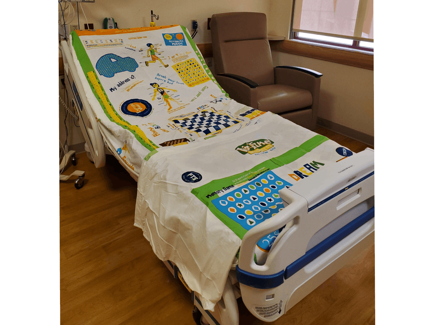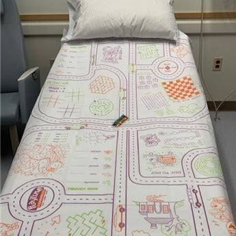Our Playtime Therapy Bed Sheets have over 65 interactive games, positive affirmations, vibrant colors, and five foreign languages. It's not just a bed; it's a world of fun and learning with oversized game boards, memory games, interactive checkers, chess, tic tac toe, math and grammar games, word find games, science experiments, exercise routines, geography quizzes, and more! The fun doesn't stop there- it also includes printable game pieces and many games designed for kids to sit up and play. Our Playtime Therapy Bed Sheets are more than just a source of entertainment. They offer comfort, providing physical, mental, and emotional relief to alleviate distress and anxiety. They normalize the hospital experience, making the unfamiliar bed feel safe and fun, along with activities kids enjoy daily. Most importantly, they provide emotional support, serving as an outlet for children's emotions to ease fear and anxiety around treatments, stressors, and grief.